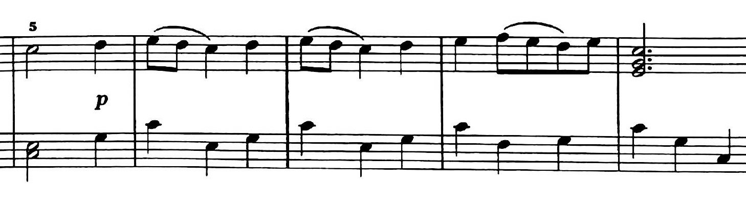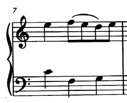 - 第7小節,有4個8分音符,其中3個8分音符有圓滑線,但第4個沒有,這個情況下,第4個音要斷奏,將它與圓滑線的3個音分開