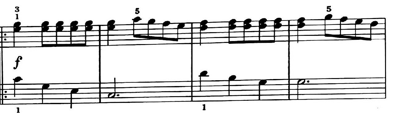 - 第4小節(第3拍)至第8小節和第20小節(第3拍)至第24小節,這2處音量突然從強(forte) 轉至弱(piano)。注意這裡要彈奏出明顯的強弱對比,聲音的轉變是突然地轉弱,而不是續漸地的。