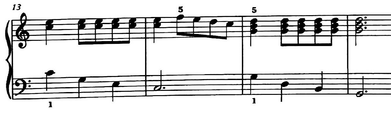 - 第9,11,13,15,18和19小節,右手需要彈奏雙音(double notes)和三和弦(triads),特別注意右手的五指不能折指,要保持良好的手型,讓手指有足夠的支撐力彈奏出有力度和均勻的音色。